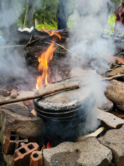 Dann sind wir weiter durch den Wald gelaufen, bis wir endlich beim Waldsofa angekommen sind. Dort waren schon Frau Thuner und Frau Bieri. Sie hatten ein Feuer gemacht.