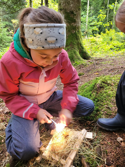 Dann haben uns die Lehrerinnen erklärt, was wir heute machen. Wir wurden in zwei Gruppen eingeteilt. Die Klasse grün ist mit Frau Schärli Feuer machen gegangen. Die Klasse gelb durfte schnitzen. Wir durften uns im Wald einen Stock suchen und daraus entweder einen Speer, einen Bogen oder einen Traumfänger basteln. Das war für unser NMG-Thema "Steinzeit".