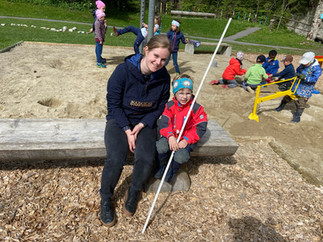 In drei Gruppen wurde die natürliche Umgebung auf verschieden Arten ausgemessen. Die Kinder benutzten dabei körpereigene Messinstrumente, Meter, Doppelmeter, Messbänder und sogar mit einem Messrad durfte experimentiert werden. Jedes Kind konnte seinen Möglichkeiten entsprechend Messerfahrungen sammeln und die Begriffe lang und kurz mit Tätigkeiten verknüpfen.