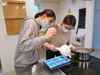 Eine Wahlfachgruppe befasste sich im Zusammenhang mit den Fächern WAH und BG mit der Herstellung von Seifen. Die Lernenden gründeten hierfür ein imaginäres Startup mit dem Namen «Sei Fan» und entwickelten erste Prototypen ihrer Seifen. Nach Abschluss der Entwicklungsphase ging es in die Produktion über in der rund 170 Seifen mit verschiedenen Farben und Düften hergestellt wurden. Anschliessend wurden diese liebevoll verpackt, ein Logo und Slogan entworfen, der Preis pro Seife festgelegt und Werbung für soziale Medien gestaltet. Anschliessend konnten durch verschiedene Kanäle die Seifen vertrieben werden. So erwirtschaftete die Klasse am Ende gar etwas Gewinn für die Klassenkasse.